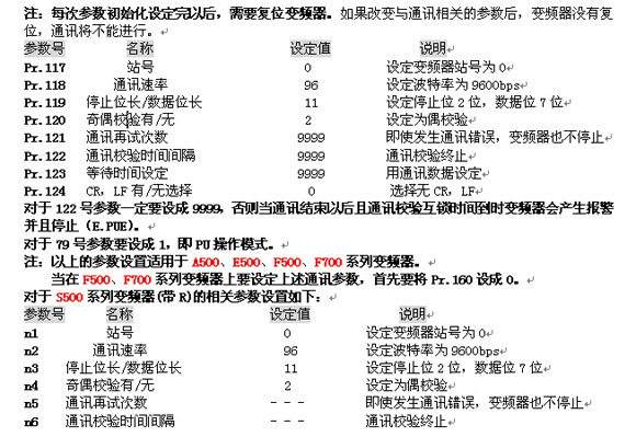 PLC和变频器之间进行通讯,通讯规格必须在变频器的初始化中设定,如果没有进行初始设定或有一个错误的设定,数据将不能进行传输。