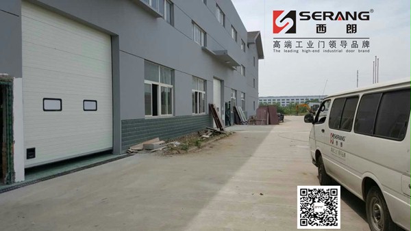 工厂厂房外部用工业提升门,旁边停靠为SERANG西朗工程服务车,带着SERANG西朗LOGO为工业客户提供专业周到及时的服务。