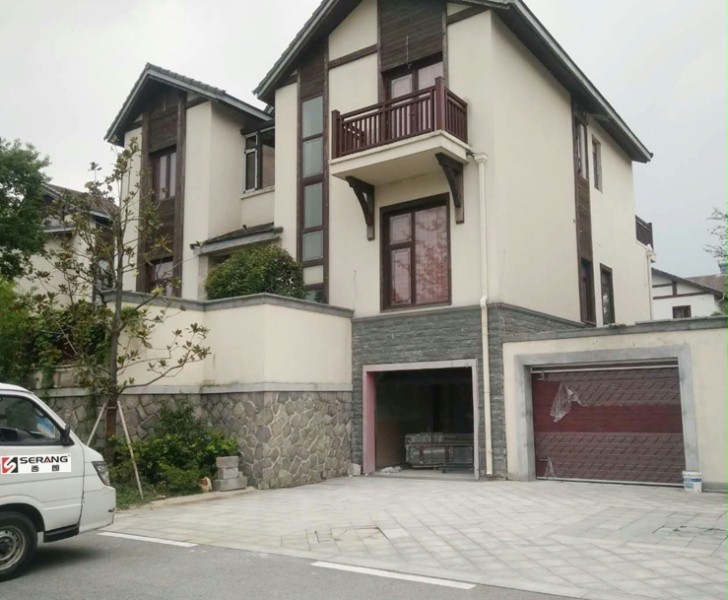 苏州太湖边别墅区业主安装SERANG(西朗)欧标高端翻板车库门,为配合别墅外立面色调,西朗专门为客户订制了同一色系的翻板车库门门板,以达到安装后建筑整体色调统一美观的住宅美学效果。