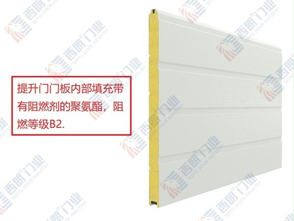 提升门的材质是用双层彩钢板中间夹着高密度的聚氨酯气泡合成,门板虽然没有防火的功能,但是具有B2级别的阻燃功能。其中高密度的聚氨酯气泡起到了很多的作用,聚氨酯气泡材料是憎水材料,不会因为吸水而增大导热系数。聚氨酯在燃烧时不会产生有害的其他,并且能迅速形成灰,一定程度上隔断了火势的蔓延,保护了下层的气泡。
