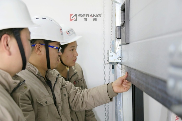 上图为:苏州西朗门业技术人员在进行工业提升门的安装调试