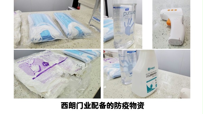 西朗门业复工防护物资:医用口罩、消毒洗手液、杀毒液、额温仪、一次性手套等