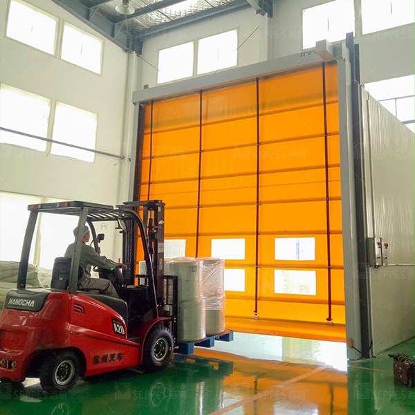 抗风堆积式快速卷帘门采用折叠提升方式和多条内置或外置式横向抗风杠杆,使风压可以均布于门帘整体,可抗约10 级左右强风,其抗风性能远高于常规滚筒式快速卷帘门,特别适用于物流通道和大面积的洞口环境。同时可选配地磁自动感应开门,物流车辆等金属物体经过时,门体自动开启,满足频繁开关的实际使用需要。