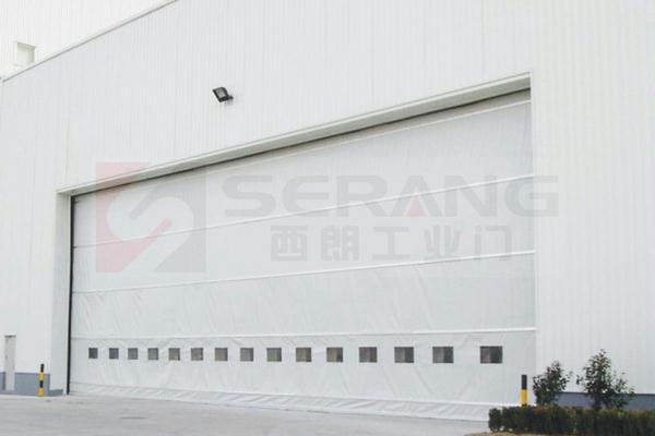 西朗门业生产的柔性提升大门,由多层抗风机构、可升降式吊柱、提升驱动系统、导向密封系统和电控系统组成,具有占地面积小(不需门库)、无地轨、结构新颖、抗风、隔音、保温等优点。由专用起升机构来实现大门的升降启闭,通常用于大跨度洞口以替代钢大门。广泛适用于飞机库、船厂、大型机械的喷砂、喷漆及维修车间、大型展馆区域隔离等。